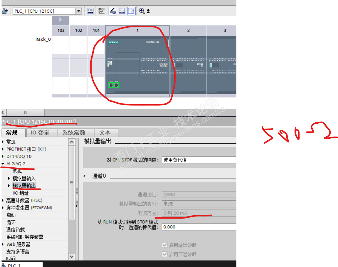 利用CPU的模拟量输出,设置为0~20mA,