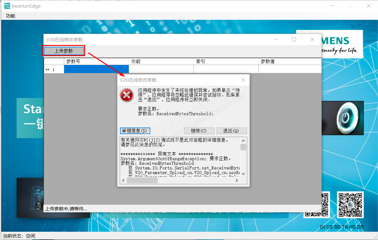 1.在V20在线修改参数页面上,点击【上传参数】按钮,过一会儿程序报错ReceivedBytesThreshold:
