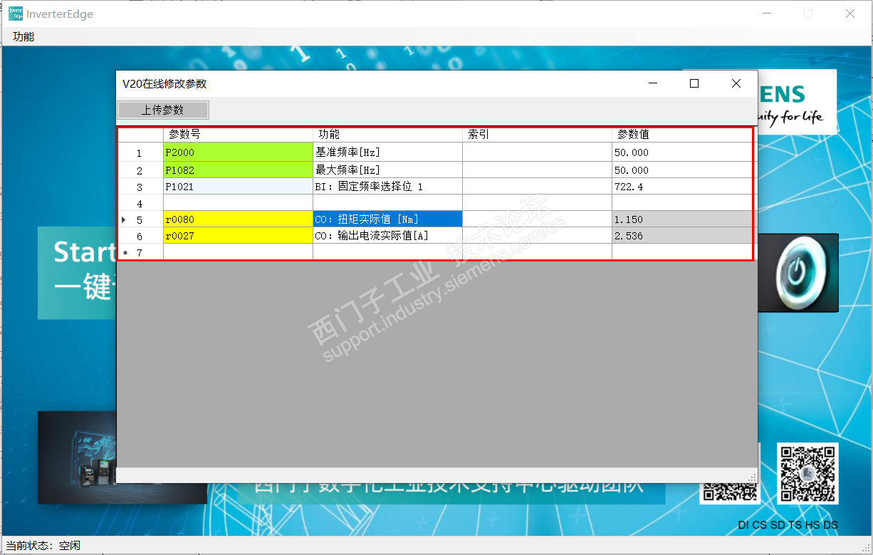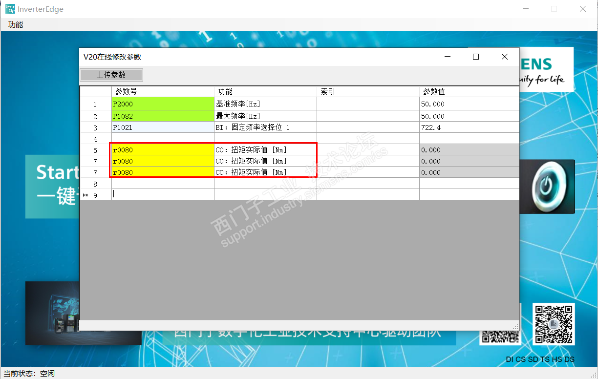 在打开软件——在线修改参数——V20页面上不点【上传参数】按钮,直接在列表中参数号中输入参数是没问题的。其实没必要保存全部参数,只需保存一些必要参数。