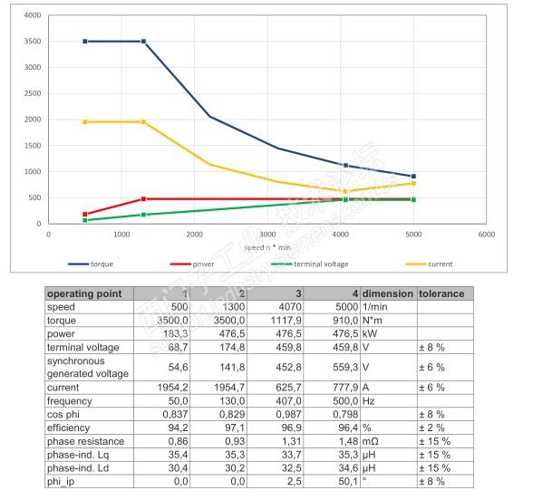请教一下,有一个测试台需要扭矩3500Nm,转动惯量1.5kgm2的电机,领导选了一款Krebs的480KW的同步电机,发现这个电机的端电压460V,反电动势560V,5000转时电机频率500Hz,电流2000A以上,这样选的变频器也要两千多安的电流,实在是太大了;然后在国内找可替代的厂家,找到一家电机厂能做国产的电机。