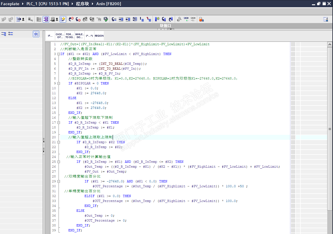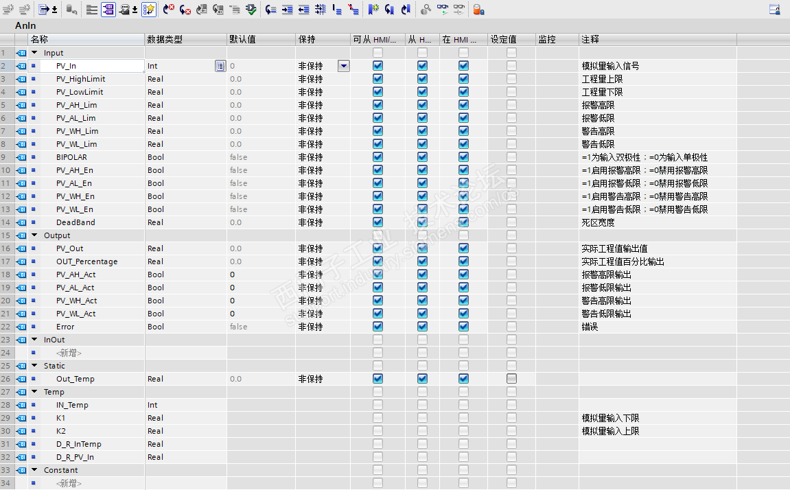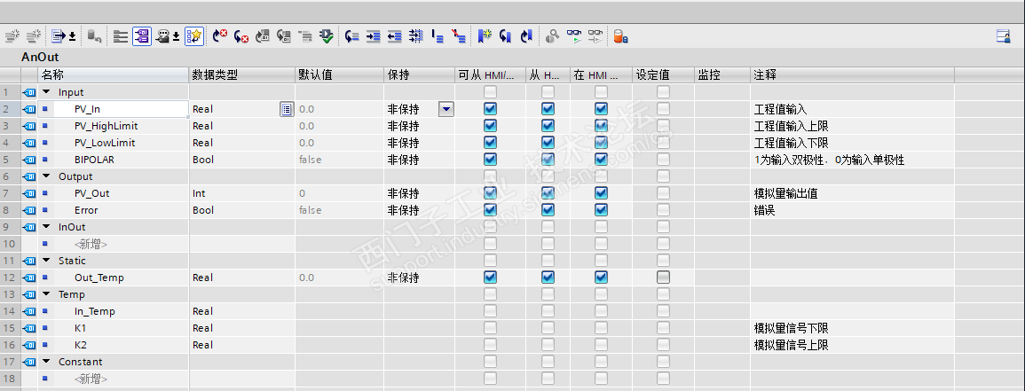 我们在实际的过程控制项目中,模拟量的比重占用很大,用西门子自带的转换程序比较繁琐,故自己根据实际需求开发了模拟量输入、输出块,便与日后使用方便,接下来就看看这个块的开发过程,编程方式采用SCL,便于计算。