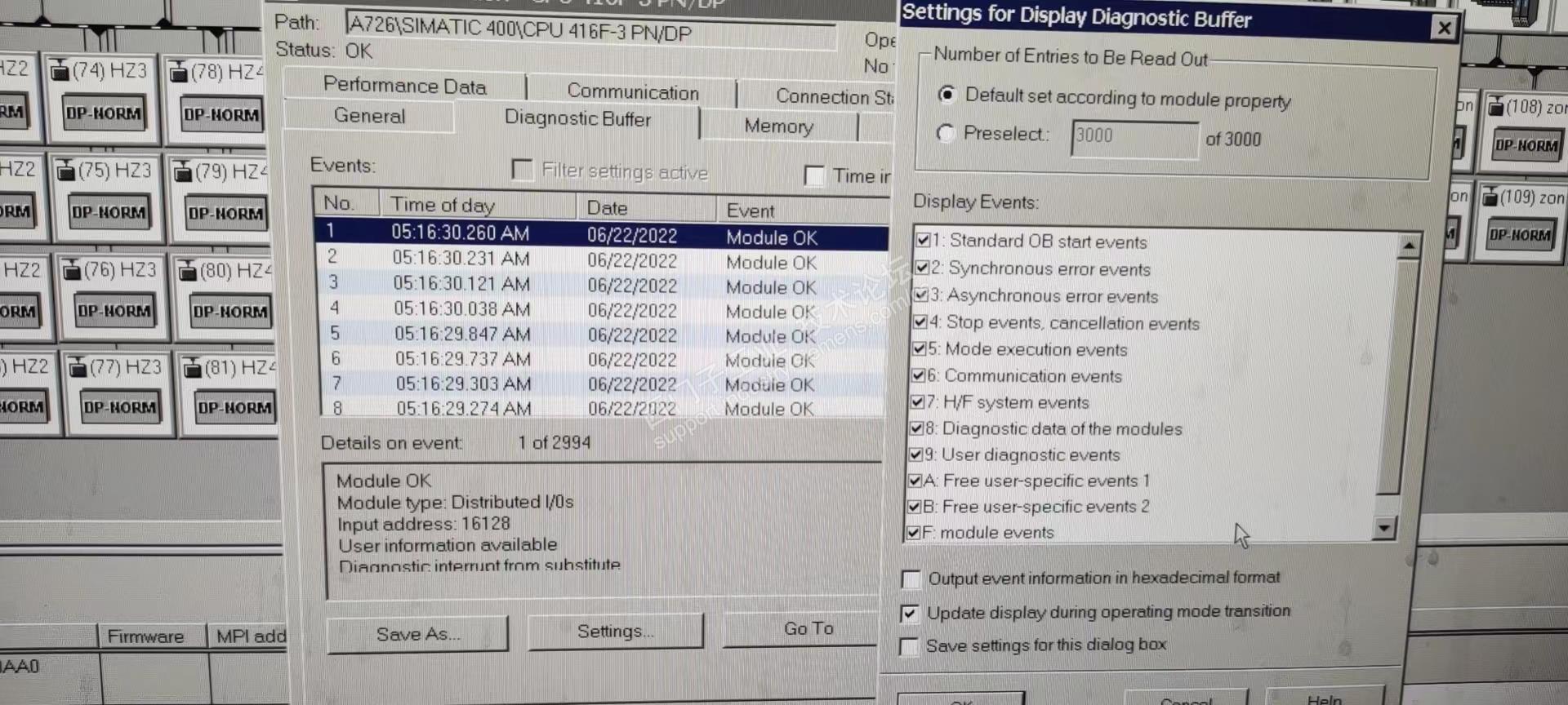 硬件组态在线,CPU的诊断缓冲区,会不断刷新模块的信息,DP通讯故障的信息很快就被这些模块的状态信息给覆盖了,不知道各位坛友是否遇到过这样的情况;该如何进行设置?