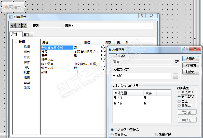 1.2修改原指令控件属性,在“允许控制员控制”动态对话框中关联变量“enable”,用于使能控制是否允许操作员控制。