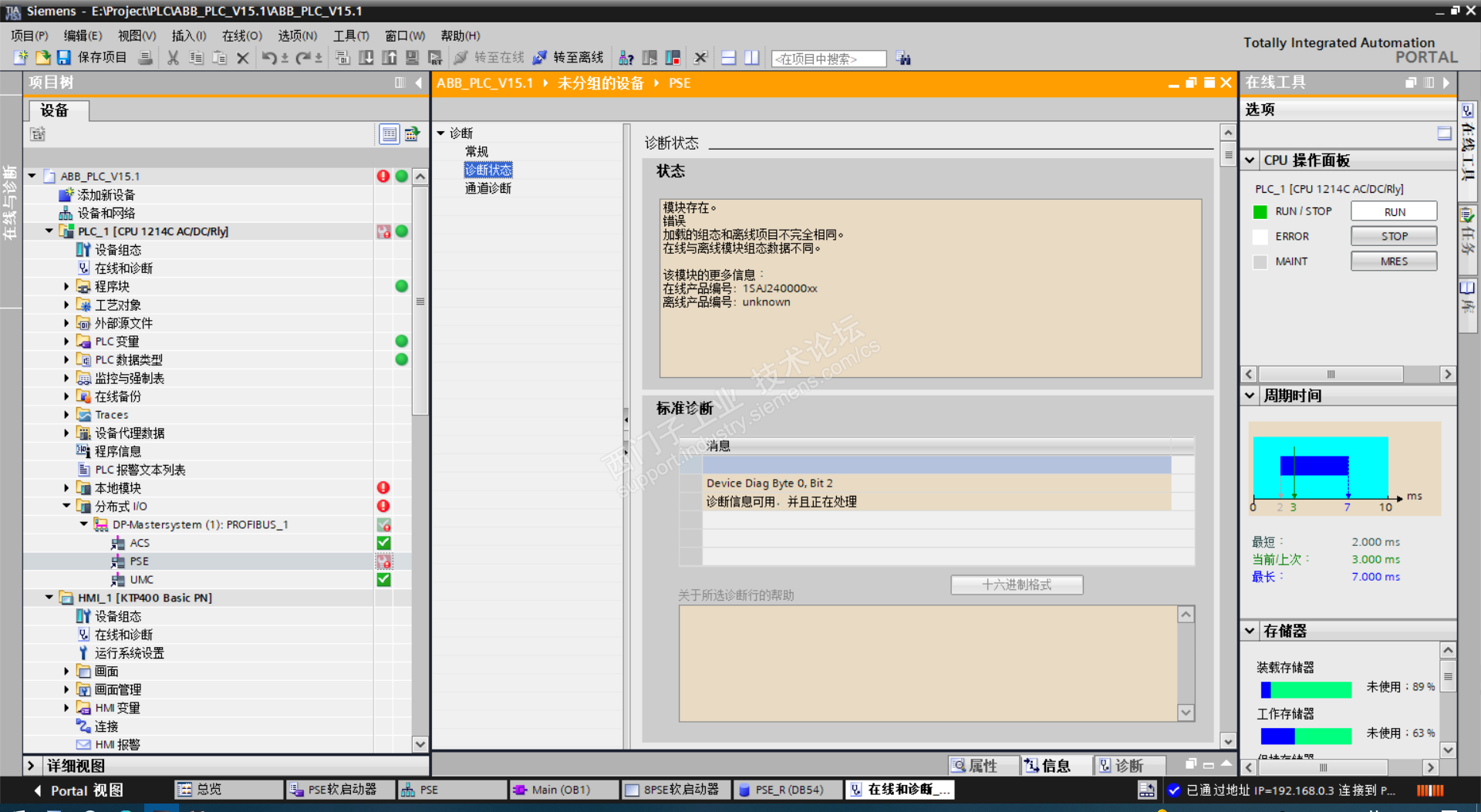 本人在学习plc,老师建议我将学校里abb实验柜里的plc改造成西门子的1200的plc,目前只剩下与软启动器的通讯了,现在的问题是我连接不能与它通讯,博图里面的报错信息是