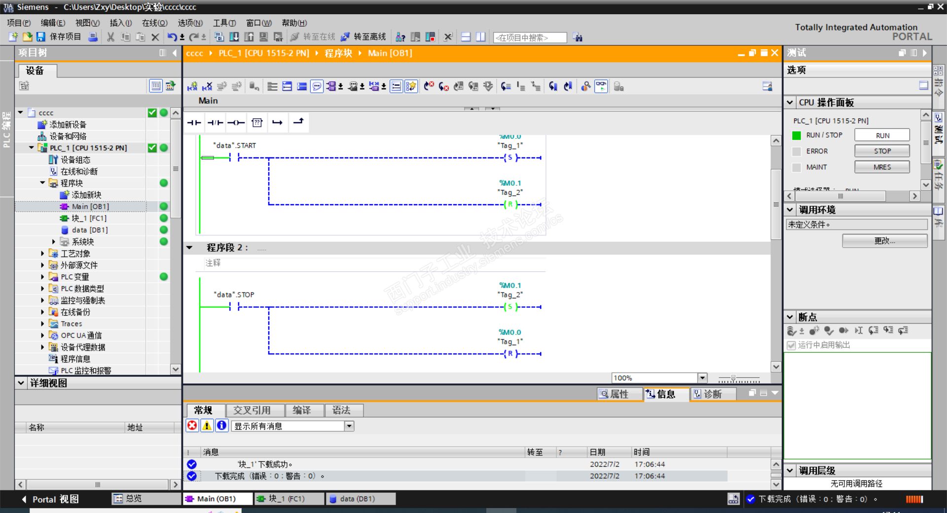 求助大佬,这个S和R指令在博途中没有用明白。当“data”START按下时,程序能够计时3s启动KM线圈,但是为什么当我按下“data”STOP按键的时候,程序直接跳过计时五秒,直接就停止了KM线圈。不是很理解,能够肯定大佬们详细的解释一下吗?很困惑,先在这里谢谢大佬们了。