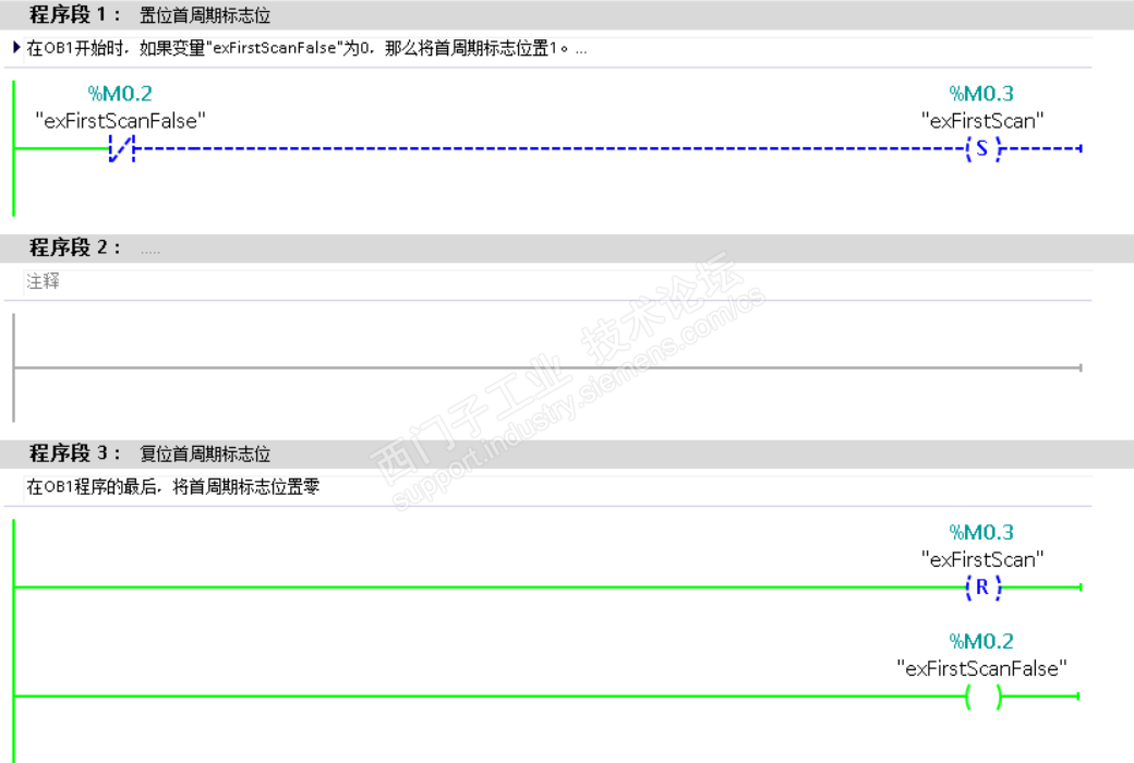 因为是首周期执行,所以不期望下一周期再置位firstscan,所以最后再给M0.4赋1,保证下周期nw1不会执行啊。