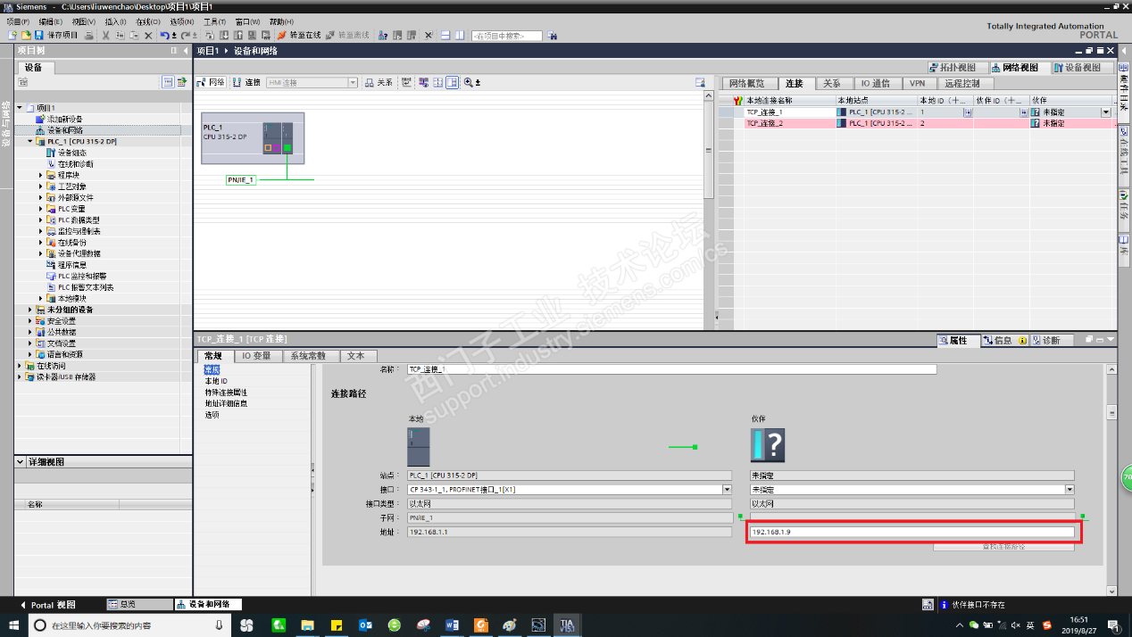 为连接配置伙伴,配置如图所示,192.168.1.9是欧姆龙PLC的IP地址。