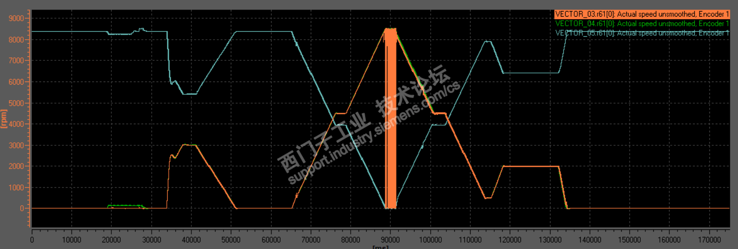 测试变速箱的台架,宝德的电机,5月份时转速8500,报F31118(曲线如图),未找到原因;将转速降低至8050运行,现在曲线和转速8500时一样,请教各位大神!是哪方面的问题?
