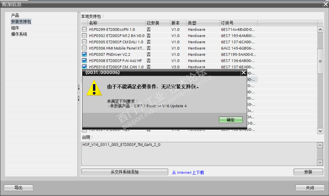 博途V16硬件目录只有驱动,没有CPU和其他模块,下载了硬支持包安装的时候提示条件不满足,这个要怎么解决?
