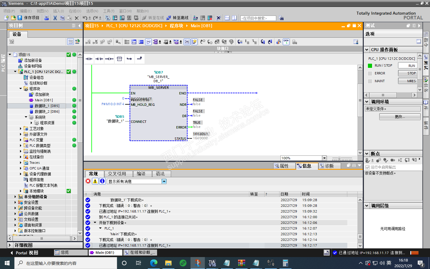 S7-1200做服务端MODBUS TCP通讯程序无法运行