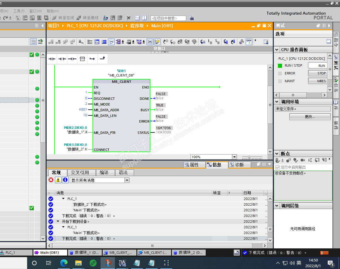 MODBUS TCP通讯,S7-1200做客户端 MODBUS TCP调试助手做服务端,连接成功,但客户端接收不到数据