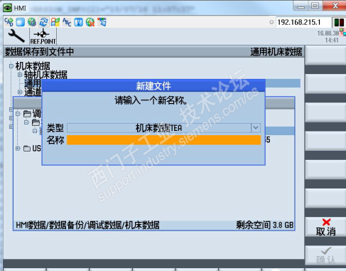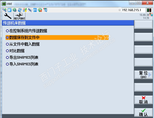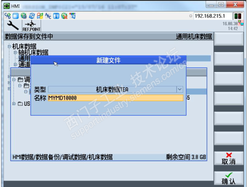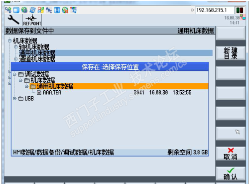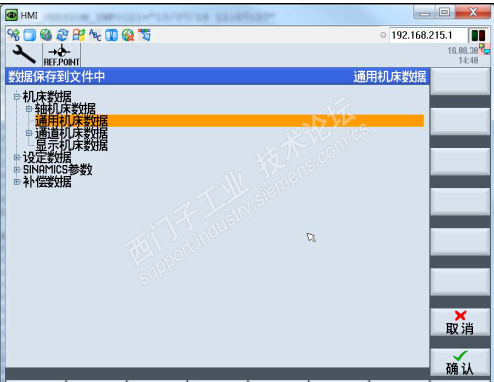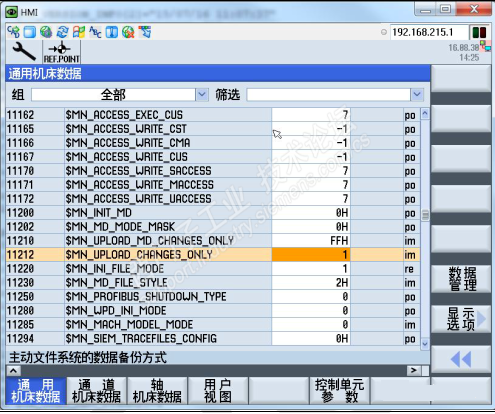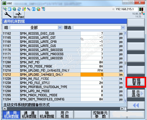 进入机床数据设定画面,每个页面(General MD,Channel MD,Axis MD 等等)都有“数据管理”按键(红色框标记出)