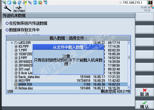 按“确认”键后,系统提示应去掉驱动使能,即保证机床在回装数据过程中不会造成危险