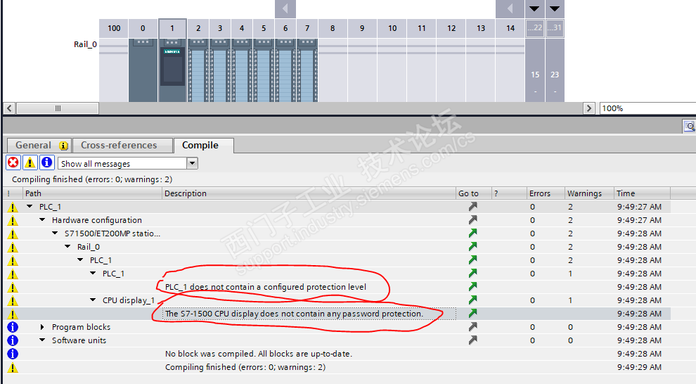 我的电脑系统为 Win10 企业版, TIA Protal V15.1 , PLC 为 S7-1511 -PN 订货号为 6ES7 511-1AK01-0AB0 ,固件版本 V2.6 , 我进行了硬件组态(没有设置保护),编译之后有2个警告 , 一个是配置没有设置保护,另一个是CPU 没有密码保护,参见附件。我想问一下,之前好像不配置保护,编译的时候没有警告,什么时候开始的没有保护,编译报警告 ?还是这个和PLC 的型号有关 ?还是其他。。。。。 多谢!!