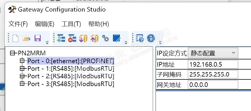 7、选择Modbus转Profinet网关对应模式(可根据连接设备类型选择主站从站模式) 本案例我们这种选择主站为例;Modbus转profinet网关 Port0 口的 IP 地址和在博图里配置的 IP 地址和设备名称保持一致;