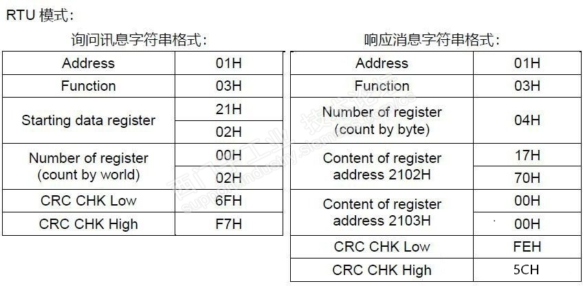 14、03H:读出寄存器内容,根据变频器Modbus报文格式可用串口调试工具对变频器报文进行监听;