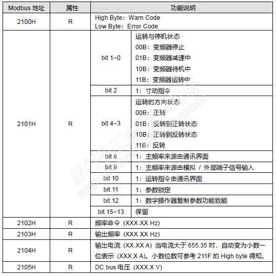 15、通过读取2101H地址的数值来确认当前变频器的状态。变频器2101H地址中数据与PLC内部QW10形成映射,通过判断Bit1-0来确认变频器的状态,若bit1-0为00则表示变频器为停止状态,若为11则表示变频器为运行状态。注意:(地址要换算成10进制);