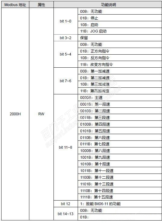 18、根据台达ME300变频器Modbus地址说明进行赋值,变频器地址2000H对应PLC内部寄存器为QW20,当给QW20赋值4114(二进制0001 0000 0001 0010)时变频器会运行,若要想PLC对变频器写值,通过给Modbus地址2000H赋值来控制变频器运行和停止。