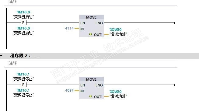 变频器停止运行,需要给QW20赋值4097(二进制0001 0000 0000 0001)注意:根据ME300变频器Modbus地址表来看,2000H的第1和2位为控制变频器运行停止的指令,故当bit1-0为10时即表示启动运行,与4114的二进制0001 0000 0001 0010相符;同理bit1-0位01时即表示停止,与4097的二进制0001 0000 0000 0001相符;