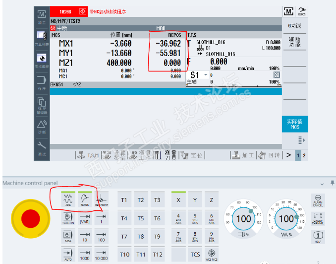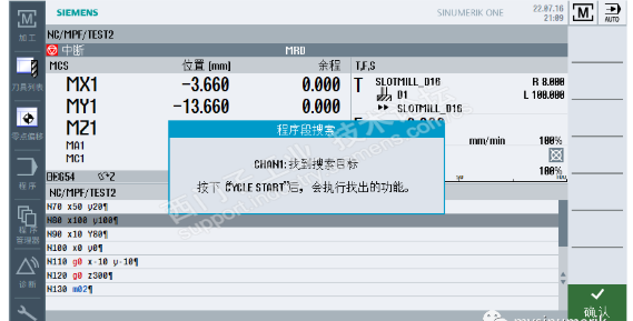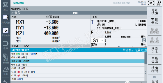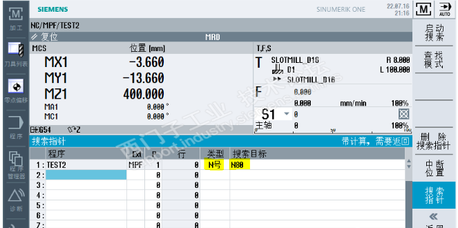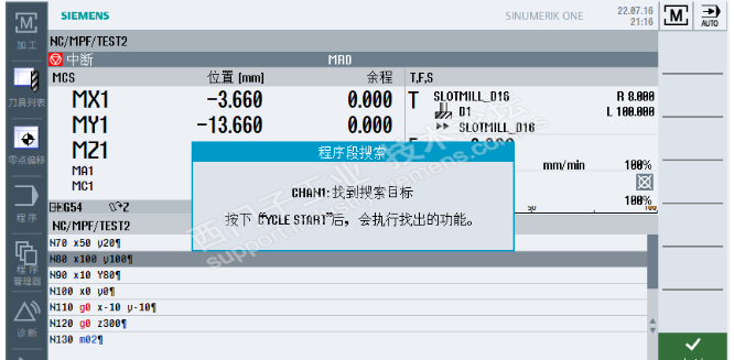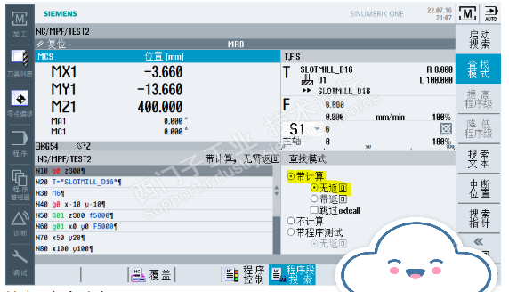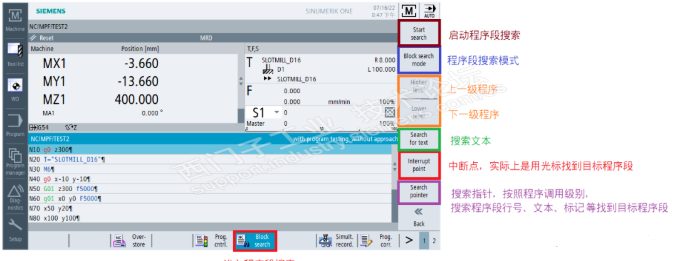 注意:段搜索操作会在“Action Block”输出M、S、T指令,所以需要有PLC的支持,即机床厂的工程师要调试好“段搜索操作”,机床操作者才能方便地使用!