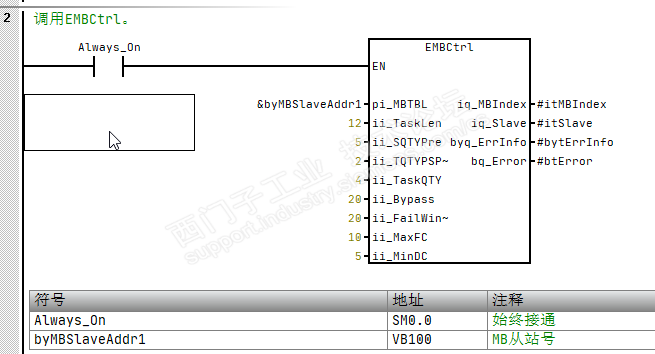 通讯主程序,调用EMBCtrl。接口参数是用户任务表首地址、预置的从站数量、每个从站的任务数量、12是固定的用户单个任务长度、实际的任务数量、出错从站通讯中被Pass的轮询次数、通讯失败的统计窗口、失败次数、成功次数。