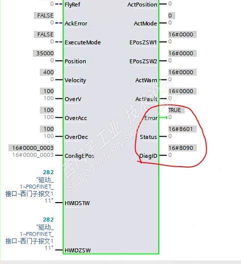 老师,您好,我在咱们西门子的实验平台做实验FB284的使用的时候遇到个问题,输出项的Error一直显示true。请问是哪里的问题呢?我一直没找到原因,我想通过监控表控制G120没反应。