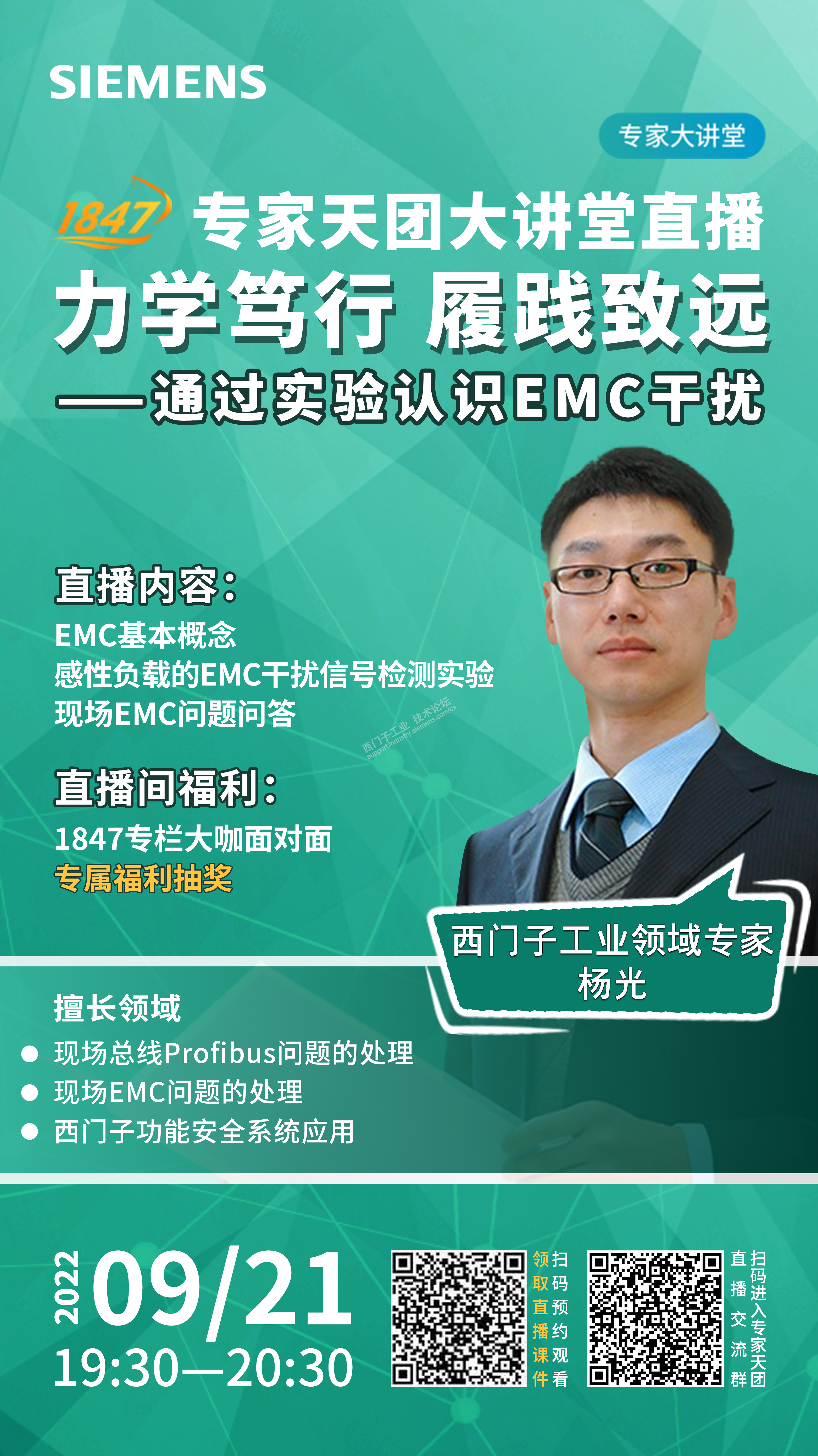 【专家大讲堂直播预告】20220921 西门子1847专家天团直播:通过实践来认识EMC干扰
