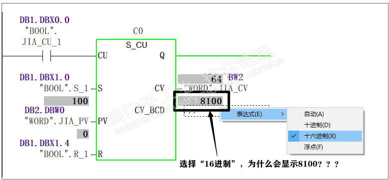 300的计数器,CV_BCD针脚在“自动”状态与“16进制”状态显示的不一样,这是咋回事,请好心的老师教我,请见配图,谢谢!