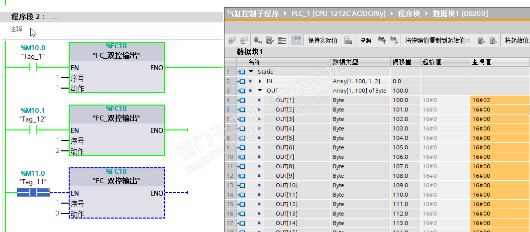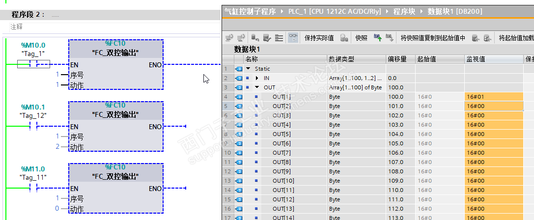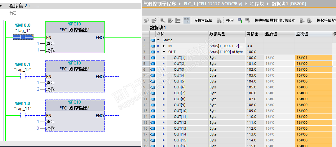输出区使用一维数组,OUT[序号] Byte,气缸伸出缩回状态值=1、=2 关联到对应Q点即可