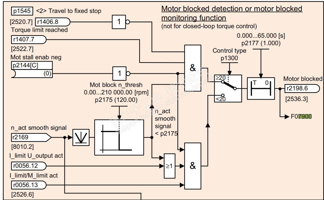 K神,这张图中,2144没有查到这个参数,P1545我应该没有涉及。我P1300是21,P2175为100,P2177是3S,如果电机实际值超过3秒,且速度达到P2175的值,r1407反馈扭矩极限到达,就会触发2900报警,我也不知道理解的有没有问题。但是哪些情况会导致速度上不来呢,机械卡死?我试过虽然费力,但是电机轴端能够动,在没有组速度、位置编码器的时候,在VF模式带负载能够正常运转。或者是扭矩设定有问题?我检查了您说的几个参数P1522/P1523是154.82/-154.82Nm,P1530 是23.83KW p1531 最开始比较小,后来我改到-23.83KW,也试过。P1530好像是组完速度、位置编码器后自动出来的。P219改为了实际的制动电阻铭牌的数值15.4KW。电机是15KW 变频器功率模块 18.5KW.
