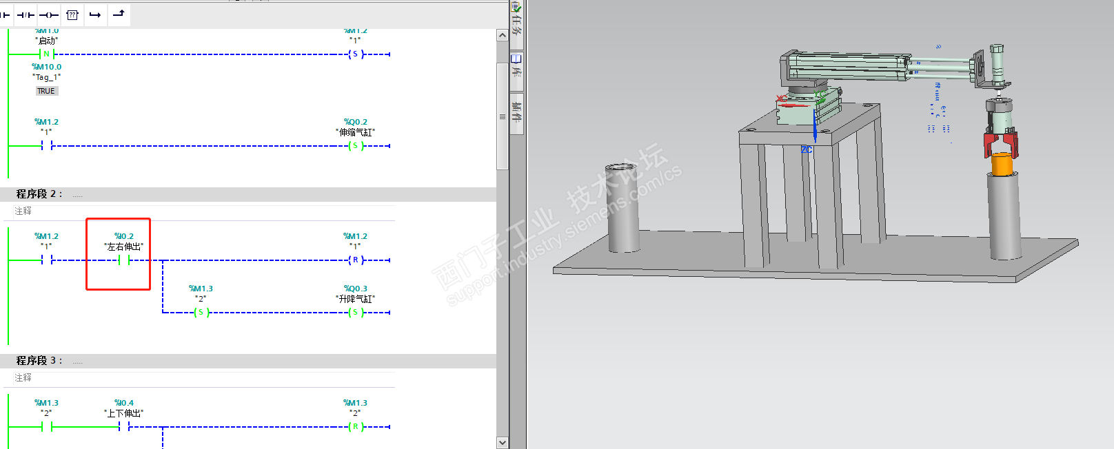 这个例程都没有HMI,直接强制PLC变量,一下次就仿真起来,因为论坛无法发视频,通过旁边PLC输入点能看出此时左右气缸处于伸出状态