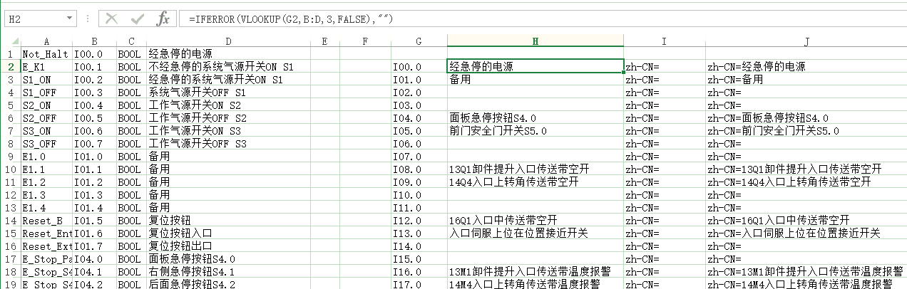 接下来的工作就是做这16个文本列表,每个文本列表里有100行(IB0-IB99),在Excel里做好,再导入到flexible就行了(屏比较老博图不支持了),其实工作都挺简单,就是在做Excel时遇到了些问题,原来的变量表顺序是I0.0、I0.1、I0.2…I1.0、I1.1、I1.2….这样的顺序,但我要的是I0.0、I1.0、I2.0…I0.1、I1.1、I2.1这样的顺序,第一列还好做有规律,一会就做完了,但第二列就麻烦了,把PLC的变量表复制过来一点一点改要很长时间,就又想偷懒的办法,想用VBA处理下,但感觉也比较麻烦,百度了下,Excel里有VLOOKUP命令,功能是按列查找,最终返回该列所需查询序列所对应的值,比如(VLOOKUP(G2,B:D,3,FALSE),就是在第B列到D列里查找G2单元格的内容,返回查找到的单元格后面第三列的内容,这样就可以按地址在原来的符号表中把注释提取出来了,感觉比VBA方便哈,如下图,前四列是在符号表中复制出来的,G列是我要用的顺序,H列是根据G列的内容,从D列取出的注释。J列是把I列和H列和在一起。