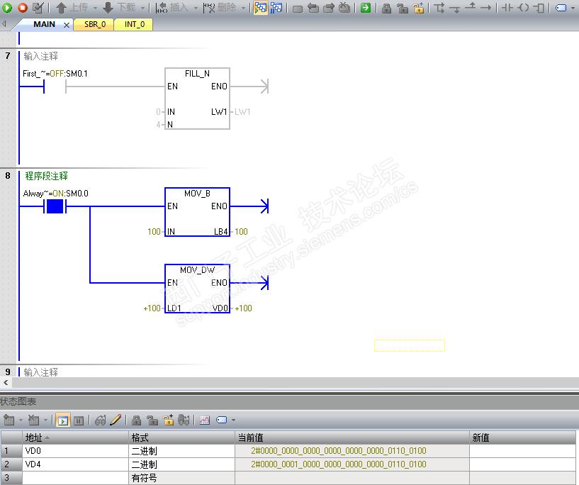 我分别在主程序和子程序中通过LD进行数据内部传输(VD0和VD4没有使用),如图