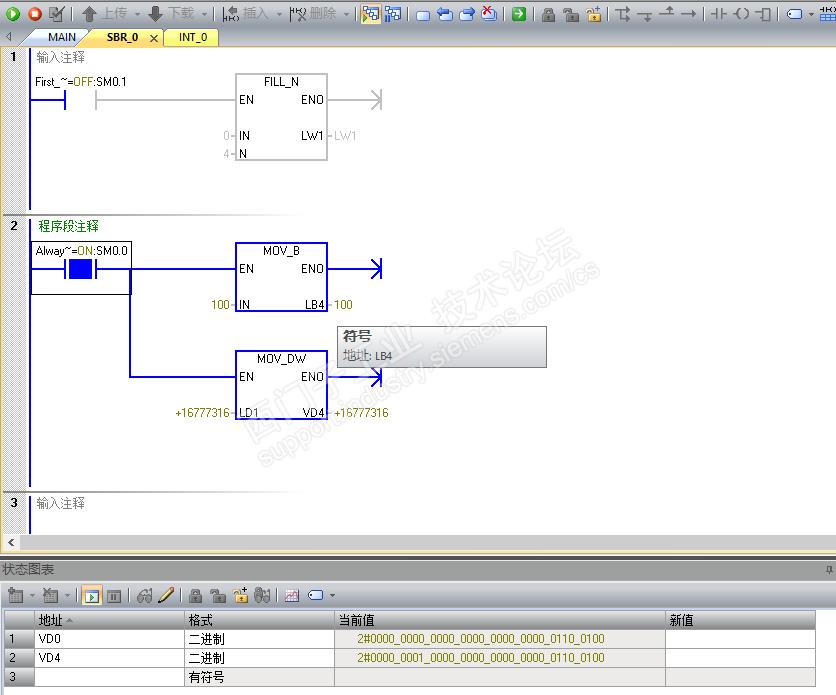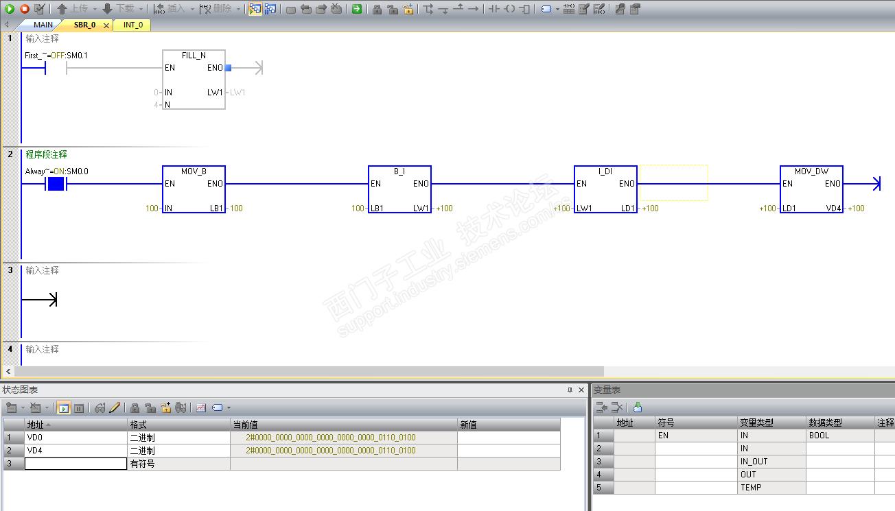 总结:LB寄存器在主程序中应用遵循字节自动移位功能,在子程序中则需要数据转换,这和V寄存器的使用还是有一定的区别,大家使用的时候需要注意!