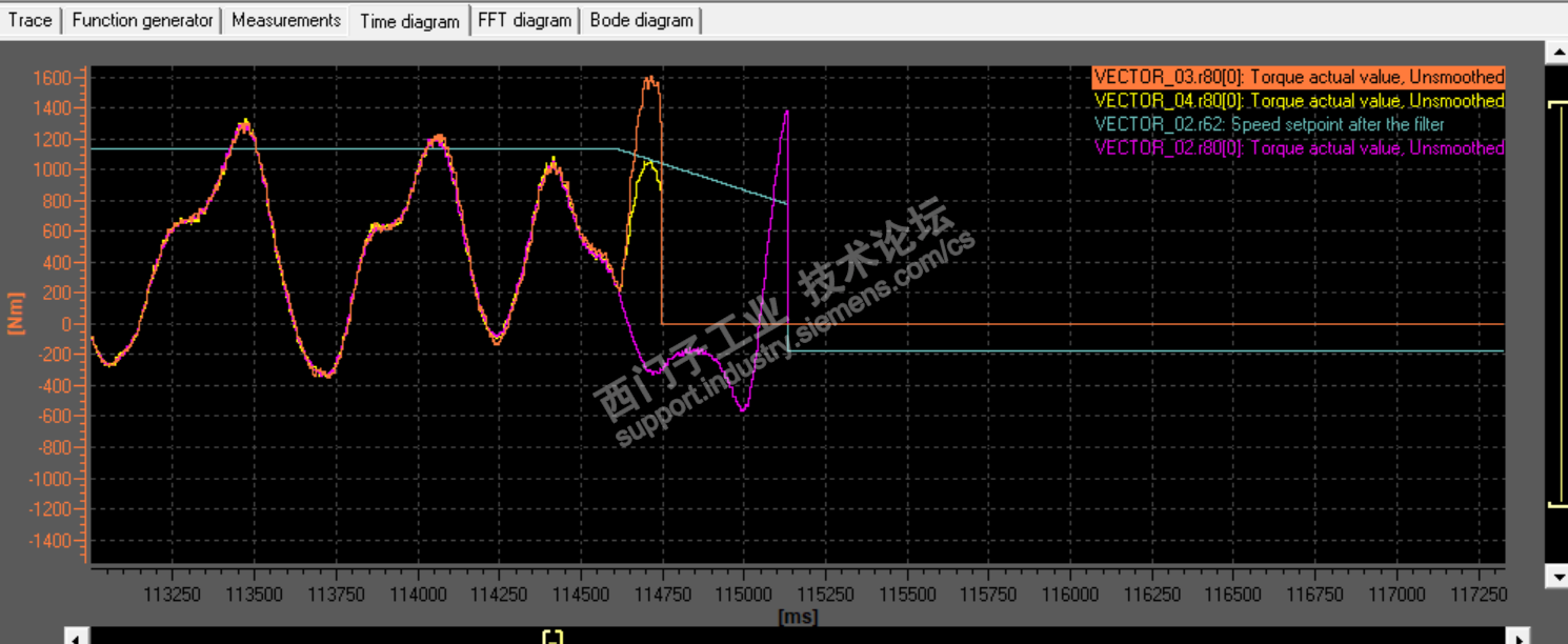 K版, 如图。 图上可以看出, 在速度给定下降这群, 主从三个转矩值基本保持一直, 也就是从机专辑跟随主机转矩。 但是在下降斜坡开始不久, 三条线出现了分离。