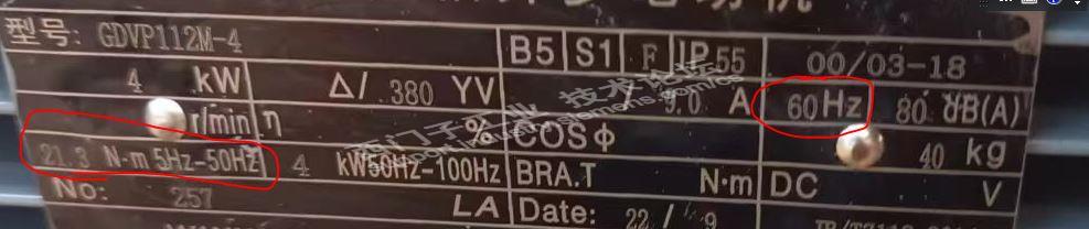铭牌标识的0-50HZ转矩,为21.3Nm,这种电机用到60HZ电源环境下,最大转矩要下降到额定的 80%吧