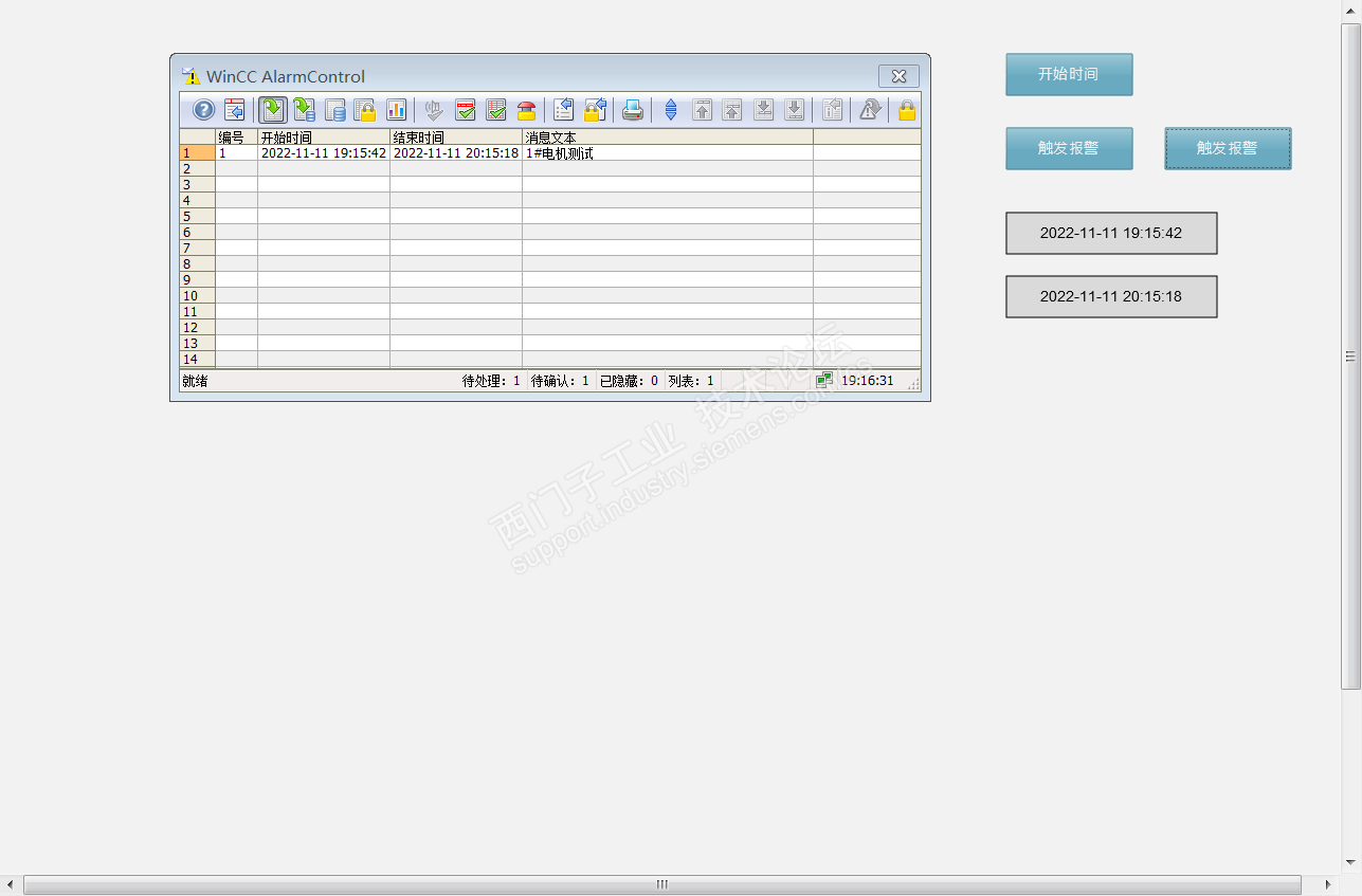 当开始测试时使用now()函数获取日期和时间,然后使用日期和时间函数获取日期和时间组成字符串(报警中的过程值不支持DT变量)存入第一个过程,当停止是再次使用now()函数获取日期和时间转换为字符串,并触发报警变量