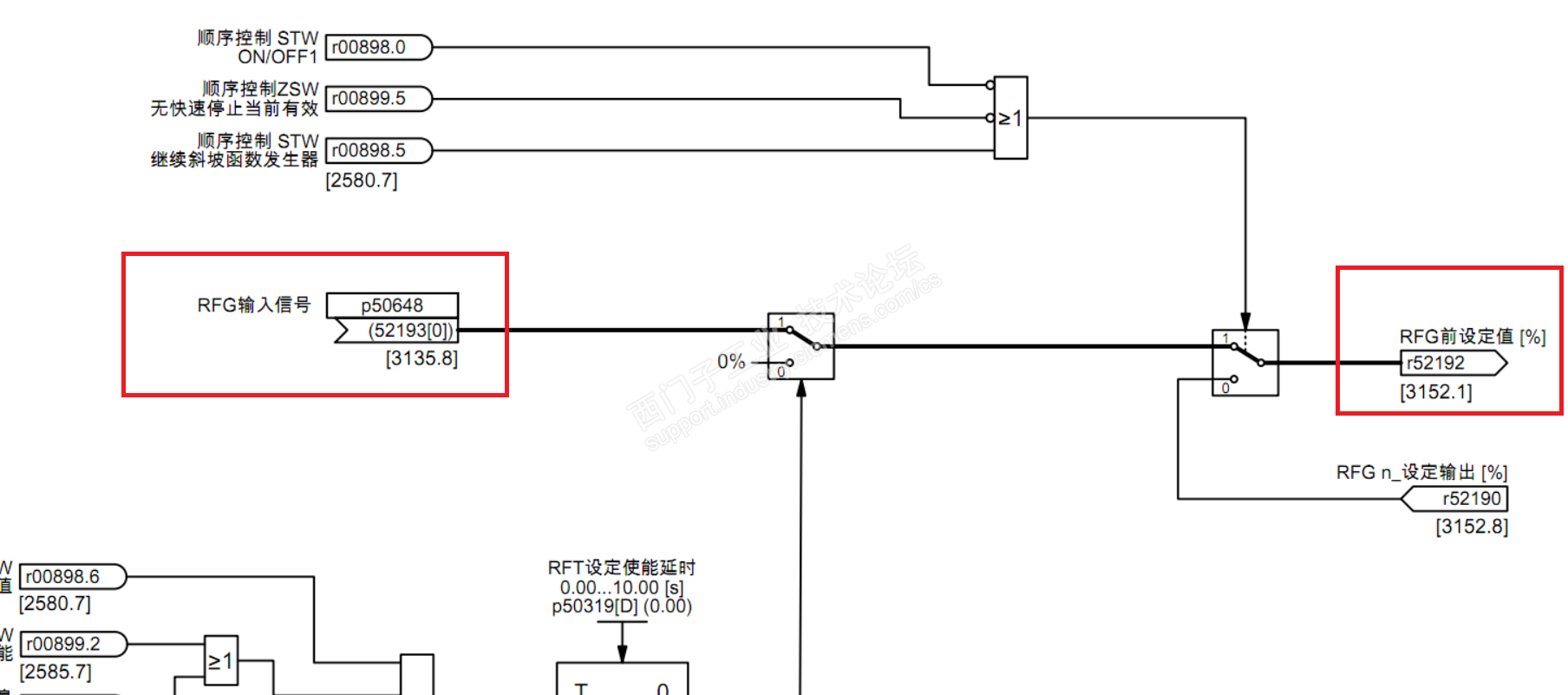 上述工作完成后,启动继电器,BOP面板显示“RUN”,电位器给定速度,r50028显示给定正常。但是r50025=0不动,电机不转,电枢无电压输出。再查看参数r52193(P50648默认值)随电位器旋转正常变化。r52190=0、r52192=0不动。于是找到对应功能图(见附图),从功能图上看对应的STW、ZSW控制参数好像无法通过BOP面板修改。