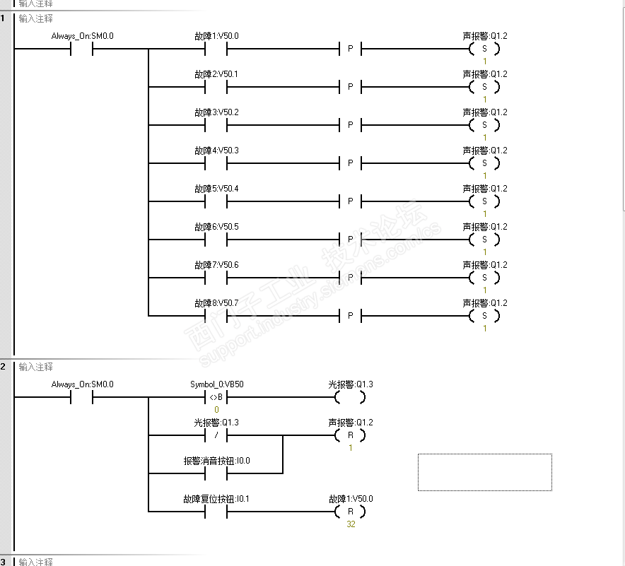在处理报警的时候习惯性的用不同的报警上升沿去置位报警器输出点,用报警消音按钮复位输出点。使用了好几年都没有问题。