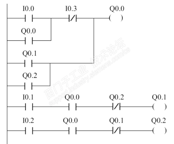 ② 先启动润滑泵,当按下启动按钮I0.0时,I0.0得电,常开触点闭合,Q0.0得电自锁,润滑泵启动。