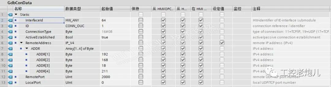 添加一个连接参数的数据块,可以自由命名,本例命名为“GdbConData”,该数据块内容见下图: