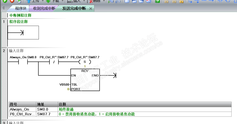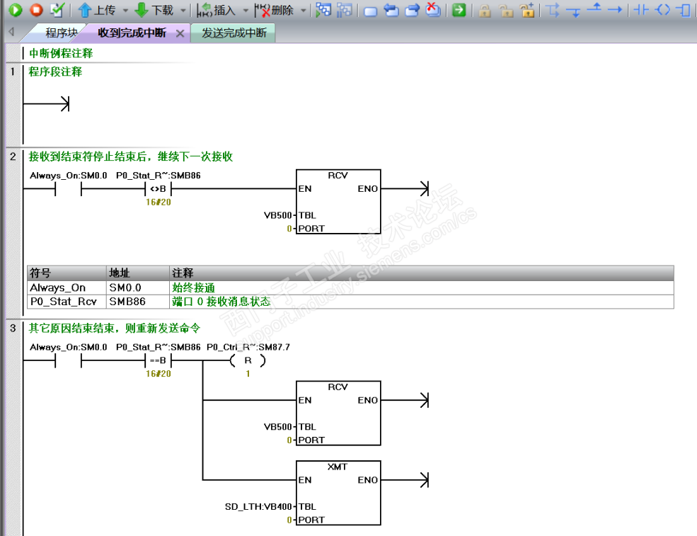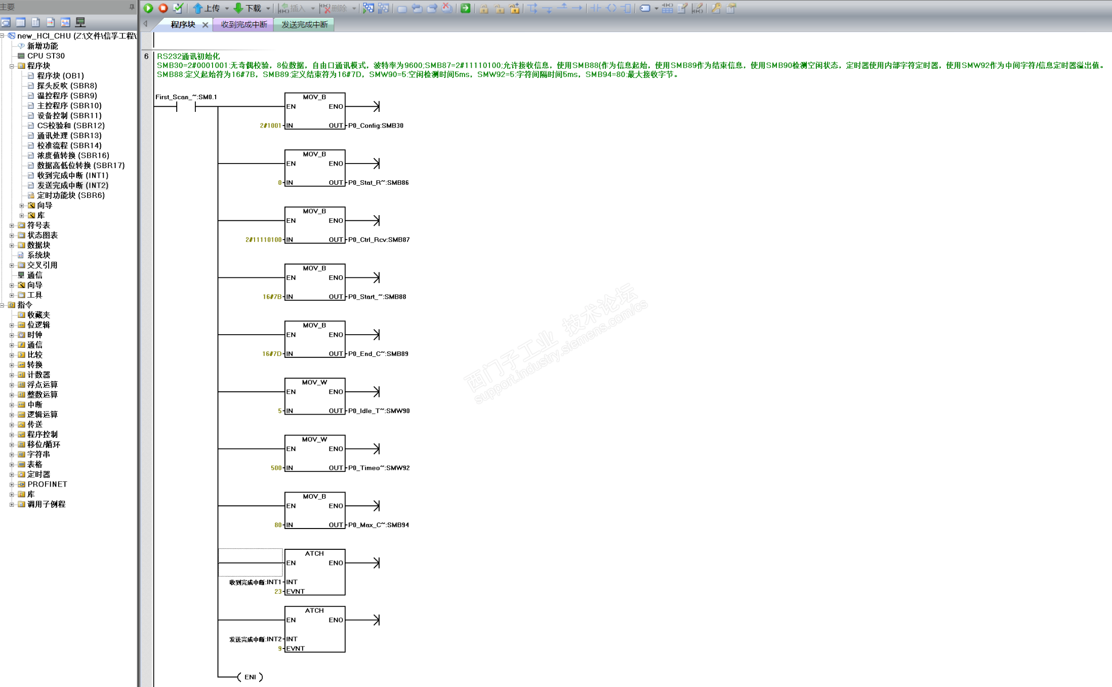 我现在有个项目,S7-200 Smart须与一台分析仪通过RS232通信,进行数据采集和仪表控制。分析仪的控制命令和数据相应有8个字节的、24个字节(测量数据)以及80个字节(设备参数)。我通过RCV和XMT进行数据接收和发送,主要程序如下: