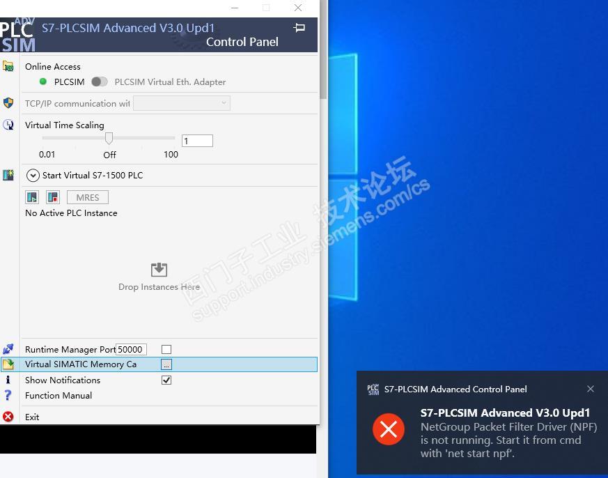 2、在打开S7-PLCSIM Advanced V3.0 Upd1后,按照课程切换Online Access时有途中右下角提示,是否与问题1有关,该怎么解决?