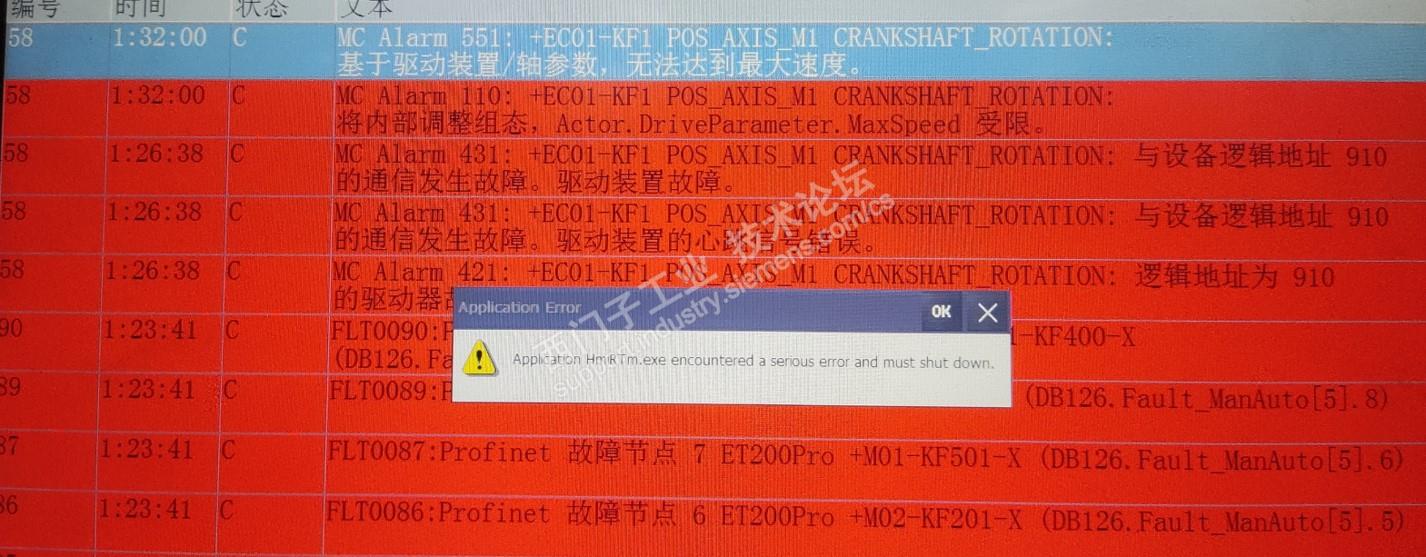 故障现象:HMI屏幕(TP1200 COMFORT),隔2~3个月,在干活时,屏幕报" application error: application HmiRTm.exe encoutered a serious error and must shut down"同时也会发生西门子伺服421、431、110、551等报警,具体可查看图片。