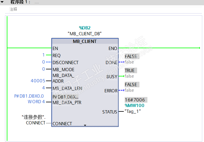 1211C做客户端,通过modbus tcp连接第三方设备,用网络助手能读数,换到PLC通过程序读数为0,不知道是哪里的原因