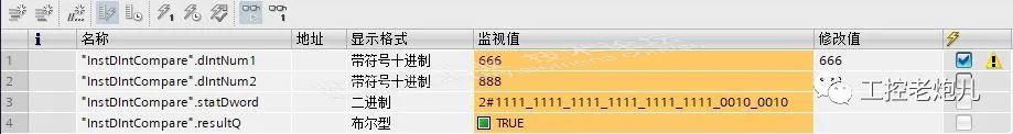 在循环OB中调用FB- “DIntCompare”,调用时会自动创建背景数据块,命名为“InstDIntCompare”,本例不使用背景数据块而是使用监控与强制表的方式进行监视和修改数据,因为背景数据块监视不能进行显示格式选择。