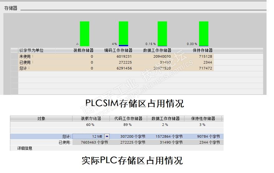 求助,为何PLCSIM显示的存储器占用情况和实际占用情况差别极大?真实的代码工作存储器已经占到了90%,但是PLCSIM中确显示仅占用4%,要不是现场人员发来提醒,就会造成巨大误判。