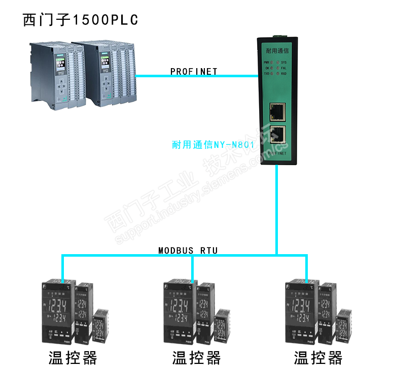1、本案例是Profinet转Modbus485网关连接电能表的配置案例,客户要求将富士电机温控器参数读取到PLC中。所需工具:西门子1200PLC一个、耐用通信Profinet转Modbus485网关一个、富士电机温控器一个;