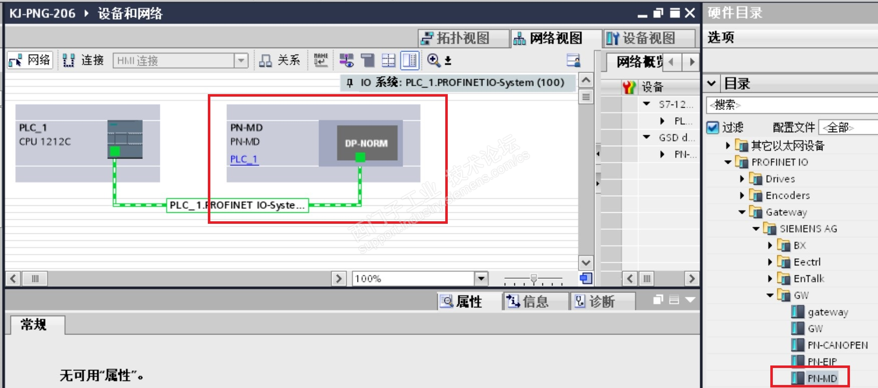 3、在网络视图添加网关模块,在硬件目录双击PN-MD添加Profinet转Modbus485网关;