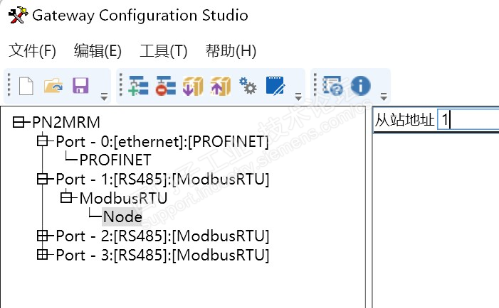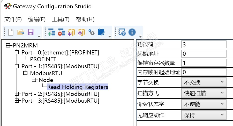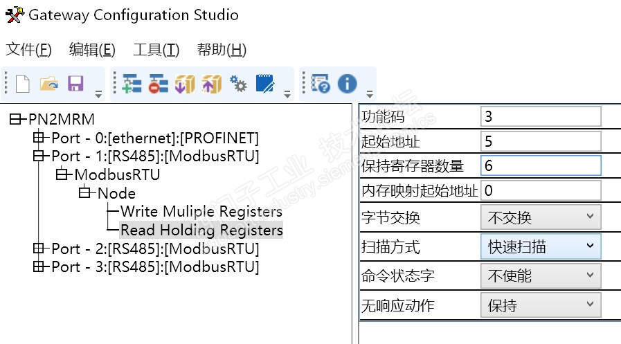 11、设定好从站的485参数,根据手册可得知,Modbus485的读写用到03H和06H,10H功能码,首先配置Profinet转Modbus485网关的读取参数。先填写Modbus485从站设备的站地址;